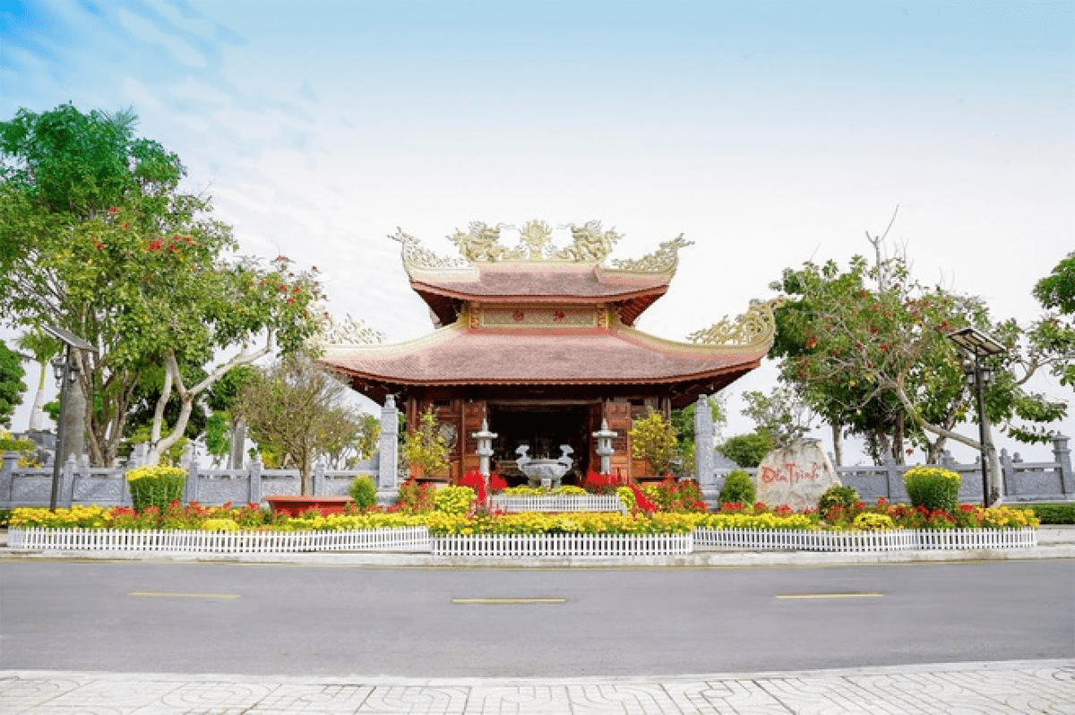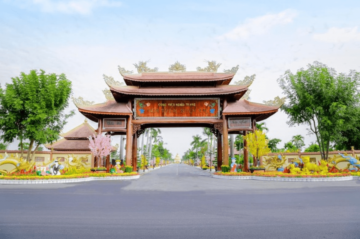Hoa viên Bình An với các công trình danh thắng như tượng Phật Thích Ca 18 m, hồ cá Koi Vũ Môn.